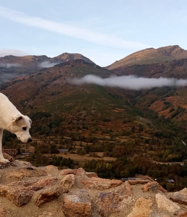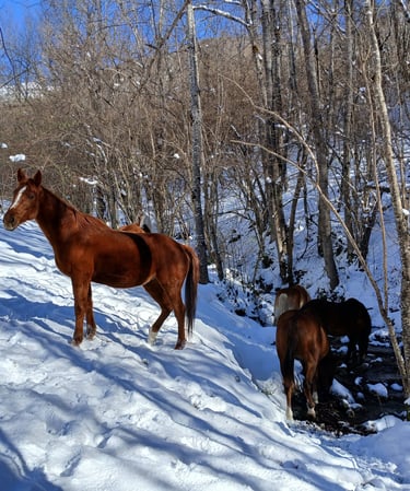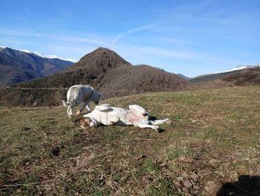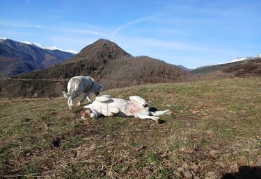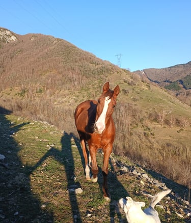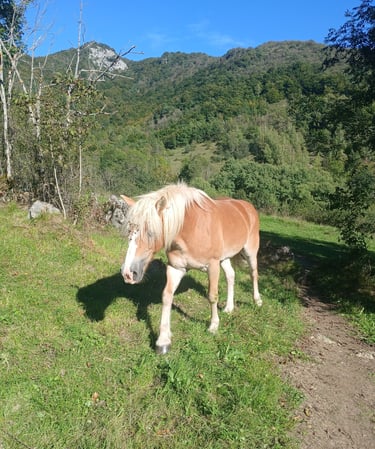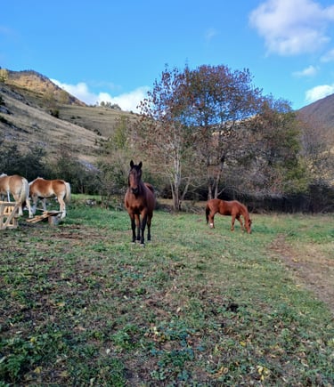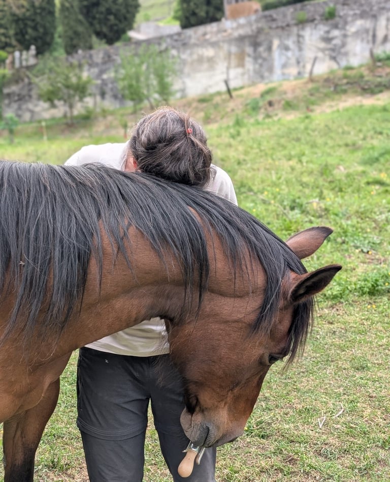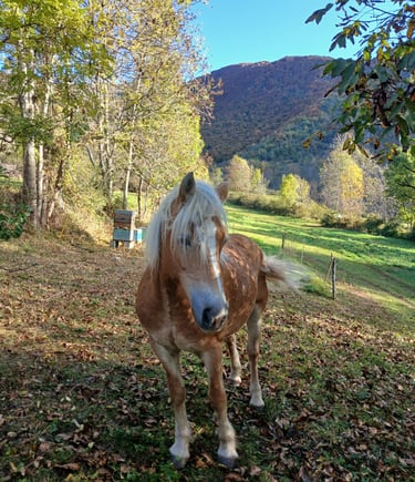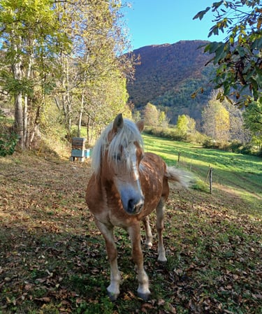 Nous l'avons rencontrée en mettant Tania en pension dans ce club... et cette jument retraitée de club mais qui n'a qu'un an de moins que Tania est devenue liée à nous instanténement. Nous avons construits joie, relation en main, souplesse et réhabilitation corporelle et avec amour au point qu'elle s'est remise à trotter et galoper dans le pré, ou en balade avec nous (Tania, Leto et moi) ^^. Nous l'avons emmenée dans ces Pyrénées Ariégeoises vers lesquelles son regard était fixé longuement certains soirs, du pré.