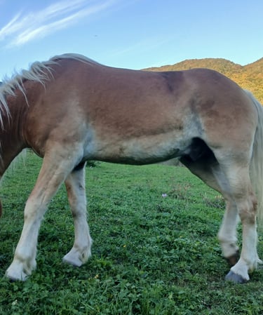 Jument de club, très probablement à débutants vu son caractère... elle a enfin pu montrer ses douleurs corporelles et psychiques dès le changement de proprio, en se couchant, simplement. Même en balade. Elle boîtait.
