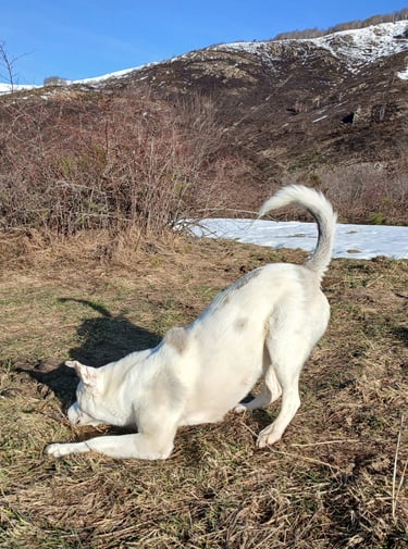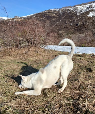 Aime léchouiller mais en poussant pour les caresses pfff, pister, jouer, jouer encore elle aussi, surveiller "sa" montagne, manger des restes de découpe encore plus que Leto.